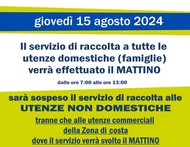 Servizio di raccolta per il giorno 15 agosto 2024 – Ferragosto