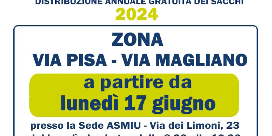 ๐—” ๐—ฝ๐—ฎ๐—ฟ๐˜๐—ถ๐—ฟ๐—ฒ ๐—ฑ๐—ฎ ๐—น๐˜‚๐—ป๐—ฒ๐—ฑ๐—ถฬ€ ๐Ÿญ๐Ÿณ ๐—ด๐—ถ๐˜‚๐—ด๐—ป๐—ผ ๐Ÿฎ๐Ÿฌ๐Ÿฎ๐Ÿฐ prende avvio la distribuzione annuale gratuita dei sacchi per la ๐—ญ๐—ข๐—ก๐—” ๐—ฉ๐—œ๐—” ๐—ฃ๐—œ๐—ฆ๐—” – ๐—ฉ๐—œ๐—” ๐— ๐—”๐—š๐—Ÿ๐—œ๐—”๐—ก๐—ข, presso la sede ASMIU di Via Dei Limoni 23, dal lunedรฌ al sabato, dalle ore 8:30 alle 13:30 (festivi esclusi).
